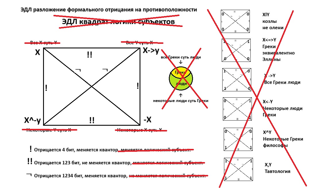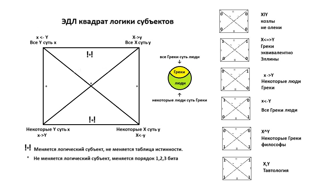 В этой теме рассмотрены различия ЭДЛ предикатов Xy и ЭДЛ субъектов XY. Представлен логический квадрат логики субъектов с учетом разложения отрицания ¬ на две противоположности ! и !!. Операция формального отрицания заменена двумя последовательными заменами логического субъекта. Для хоть какого то сходства с логическим квадратом Аристотеля, квадрат логики субъектов пришлось развернуть на 90 градусов. Современников приучили думать квадратами, а не кругами Эйлера. Пришлось произвести трансформацию квадратуры круга.