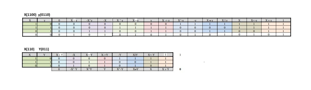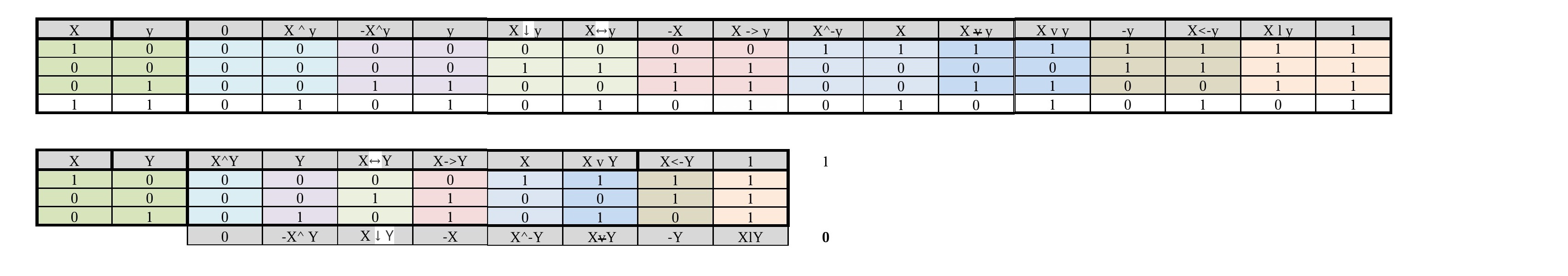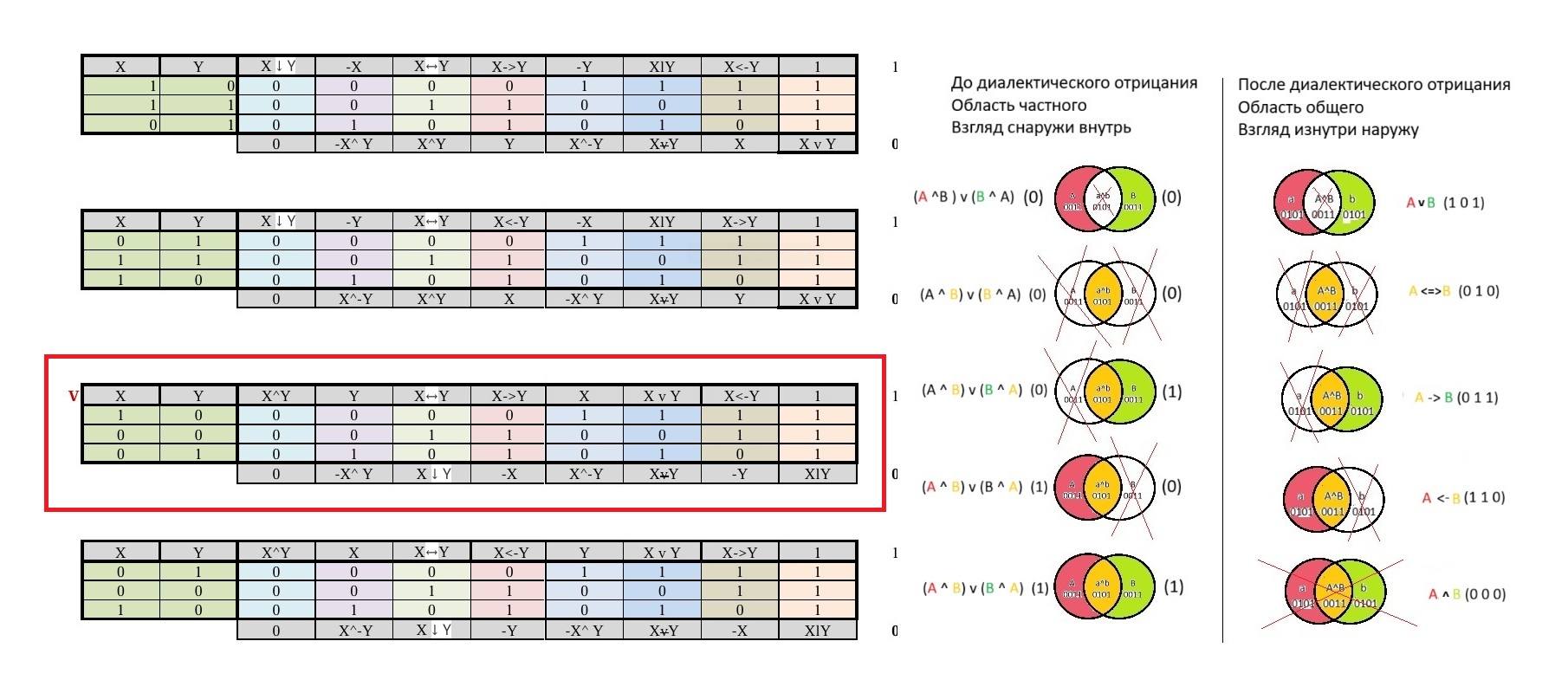 И ничего не прояснилось. Таблицы истинности не бьются ни с графическим пересечением множеств, ни с формальными записями. Вот тогда и всплыла затея Виктора убрать из таблицы истинности два ноля сверху. Структура общей таблицы истинности для 16 булевых функций понятна. Это просто двоичный код от тождественного ноля до тождественной единицы. Переменные Х и Y тоже имеются. Еще имеется свойство, что общее с частным никогда не дружит. Ты либо смотришь снаружи внутрь, либо изнутри наружу. Дизъюнкция Х и Y всегда тождественная единица пусть не из 4 элементов, а из трех.