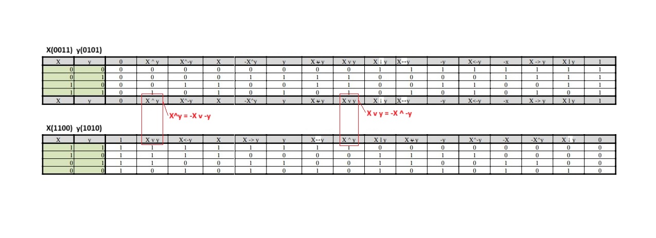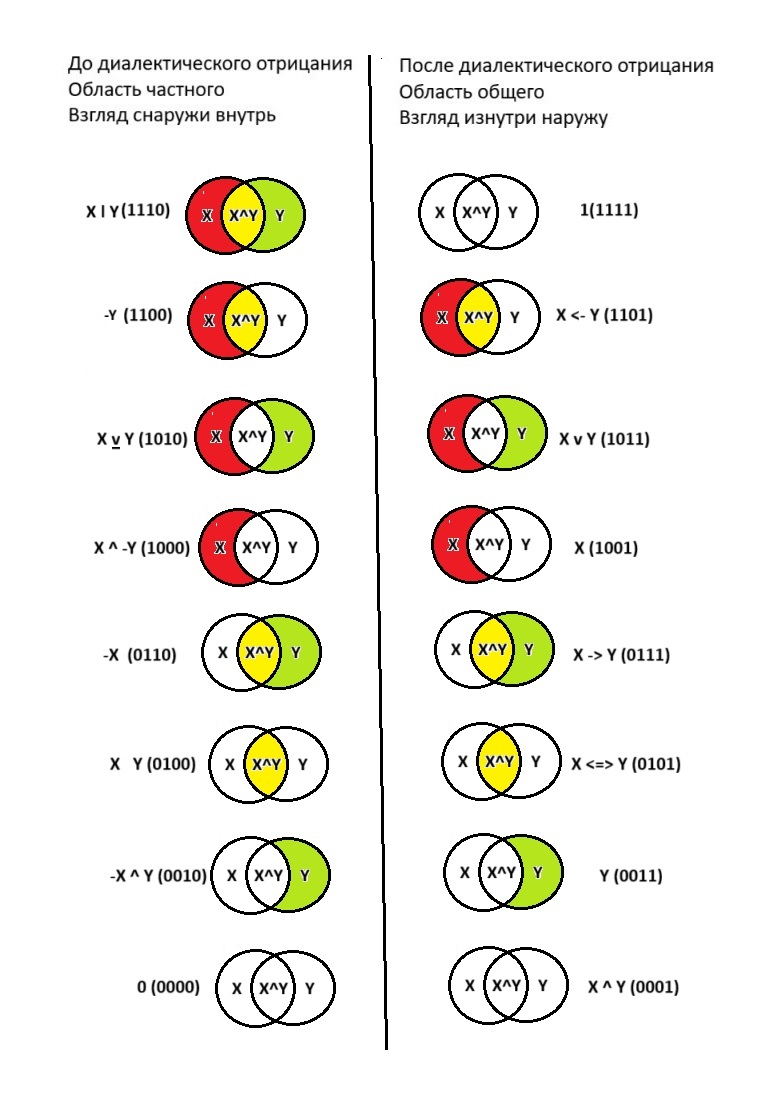 Добавить четвертый столбец с диалектическим отрицанием к таблицам истинности 16 булевых функций, вообще плевое дело. Он всегда для меня было настолько простым, что я не уделял ему никакого внимания. Стрелочками показывал чего куда обращается. Мне понятно, значит и другим должно быть понятно.