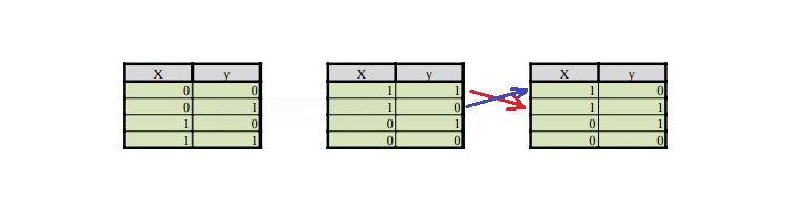 Первая строка (0 0) должна быть исключена. Это следует из закона исключения второго: две лжи ни под каким соусом не могут дать одну правду! Из этого следует одна уникальная вещь: все таблицы истинности булевой математики становятся квадратными: 3Х3! А не 4Х3, как это принято в традиционной логике. И только в таком виде здесь применимо то, что в в математике называется теорией матриц. Между прочим достаточно мощный аналитический аппарат.