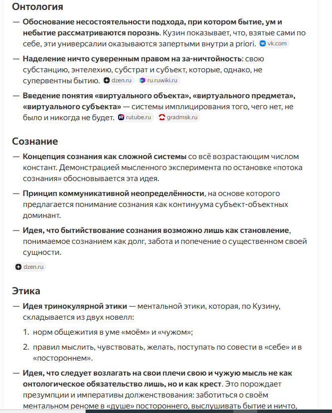 – субстраты сознания: мысль, которая крепится к самой себе, но использующая в качестве «подручного» и моё я, и интеллигибельное, и рельеф внешнего/внутреннего, чтойность/за-ничтойность. Отсюда познание, по Кузину, есть – осязание щупальце-мыслью мультиверса и встречное (обратная афферентация) вопрошание мира о смысле человеческого существования.