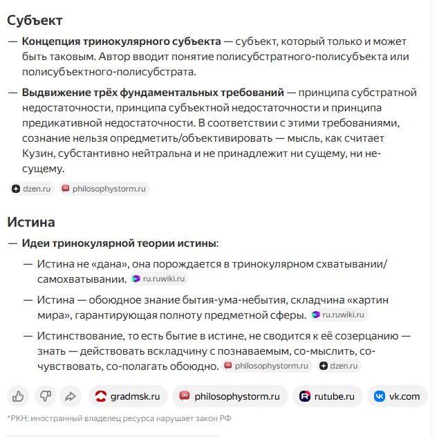 сознание – континуум субстратов, субъектов, доминант, образующих «поли-субстрат-поли-субъекта» или «поли-субъект-поли-субстрата». Сознание интерактивно, разложено по карманам бытия, небытия, обоюдного и не локализовано в теле, мозге, страте, социуме, искусственном интеллекте искусственном интеллекте.