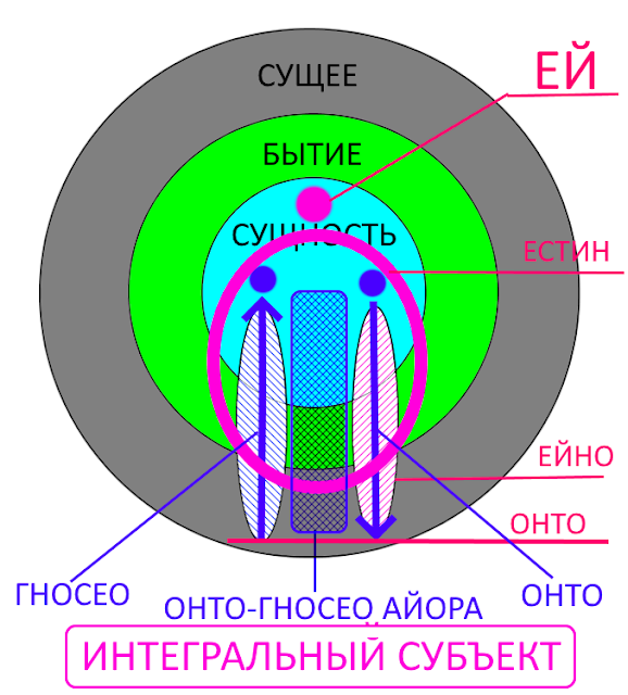 В "моём" представлении бытие охватывает некой "окружностью" регионы сущего и сущностей "потоками" управления/усиления в "прямом" и обратным потоком снятия форм, вводя их во взаимодействие "по вертикали".